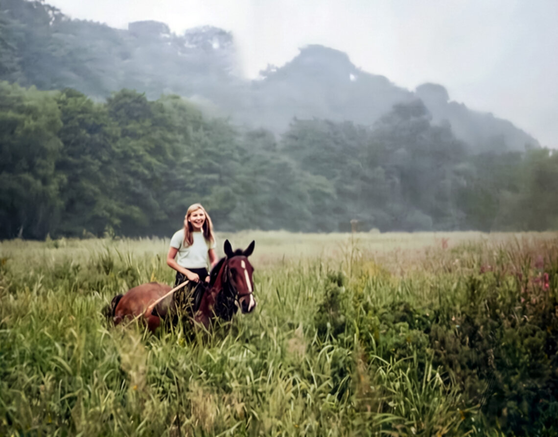 Als Teenager reitet sie viel und ausdauernd. Und sie reitet nicht nur einfach so herum, wie man das als Pferdeliebhaber in unserer Gegend wohl oder übel eben tut. Sie reitet die Pferde zum Decken und dann wieder zurück – durchs Felder und Wiesen. Sie reitet Pferde so, wie sich das in einer Züchterei ergibt: mal aus Spaß, mal wegen irgendwelcher Erfordernisse des Zuchtbetriebes. Deswegen sitzt sie auf dem Foto auch so selbstverständlich auf dem Pferd, als würde sie da ganz natürlich hingehören.