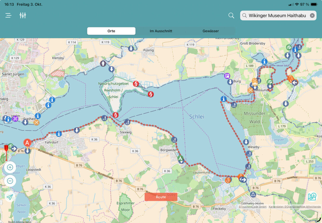 Es gibt einen Planungsteil, dort könnt Ihr auf einer Karte per Fingertipp eine Route zusammenstellen. Die App beherrscht das Autorouting – das heißt: Ihr gebt den Startpunkt ein und speichert ihn. Dann gebt Ihr den Zielpunkt ein und speichert den. Canua berechnet automatisch die Route. Hier zeigt sich auch die Spezialisierung auf Paddler: Wollt Ihr beispielsweise auf der Schlei fahren und gebt als Start „Haithabu“ und als Ziel Olpenitz ein, dann werdet Ihr feststellen, dass Canua nicht die kürzeste Strecke ausrechnet, sondern jede Bucht in der Planung ausfährt. Das deswegen, weil die App davon ausgeht, dass Kajak- und Kanufahrer sich grundsätzlich in Ufernähe aufhalten, und nicht etwa ausgedehnte Buchten schnibbeln wollen. Außerdem erhaltet Ihr beim Autorouting eine recht genaue Kilometerangabe über die ausgewählte Strecke.