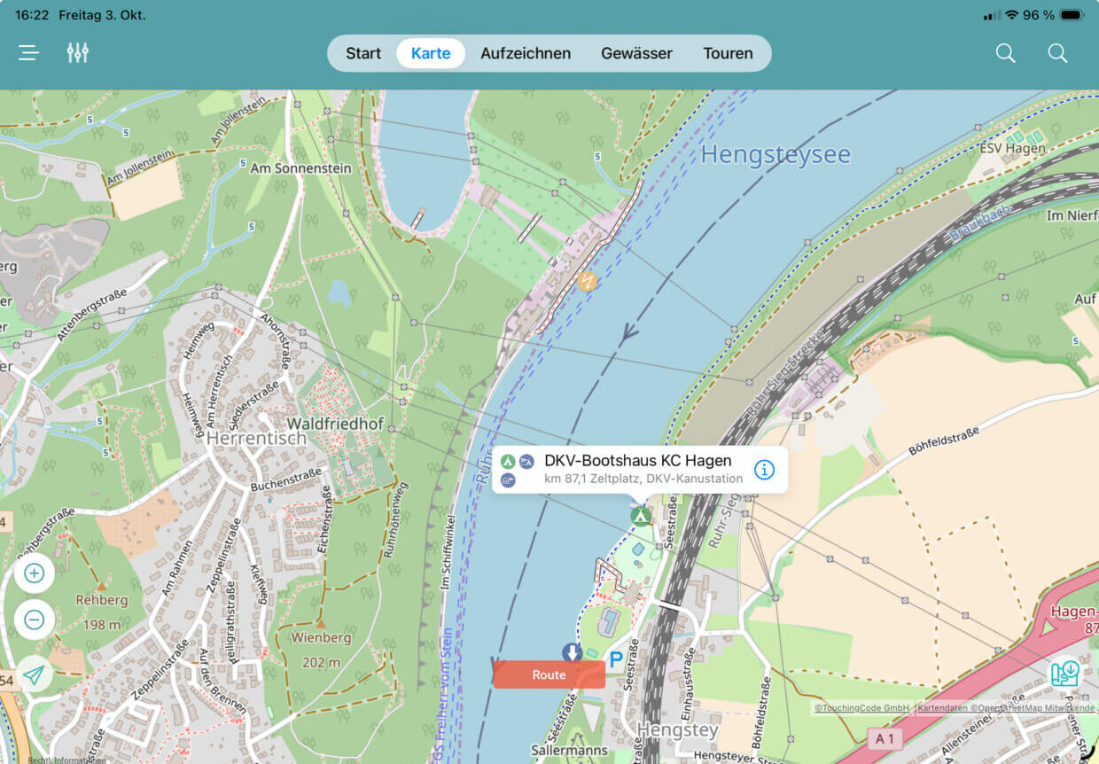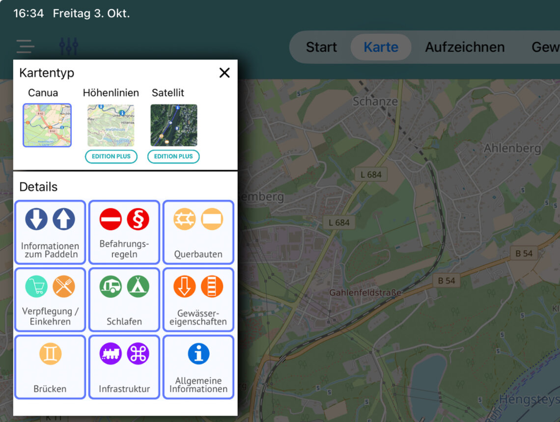 Was sehr hilfreich ist: Canua hat eine Menge Detailinformationen für Paddler. Etwa über Campingplätze und DKV-Stationen oder über Stauwehre, die zwischen Euch und Eurem Ziel liegen. Restaurants sind verzeichnet, besondere Gewässereigenschaften und Brücken. Dazu gibt es noch allgemeine Informationen. All diese Infos sind als vereinheitlichte Symbole in der Karte dargestellt. Tippt Ihr sie an, öffnet sich ein Infokasten mit weiteren Details dazu. Diese Features nutze ich sehr oft auf Fahrten.