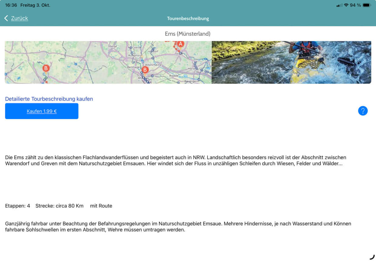 Außerdem könnt Ihr Euch auf Canua Touren empfehlen lassen. Diese Touren kann man einzeln kaufen und abspeichern. Sie kosten häufig zwischen 99 Cent und 1,99 Euro. Mehrtägige Touren sind dann in einzelne Tagesetappen unterteilt und enthalten jeweils eine kurze Charakteristik mit Hinweisen für die Etappe. Das ist sehr schön, wenn man sich einfach mal leiten lassen möchte. In der Regel sind dort auch die Übernachtungsmöglichkeiten angegeben und kurz bewertet.