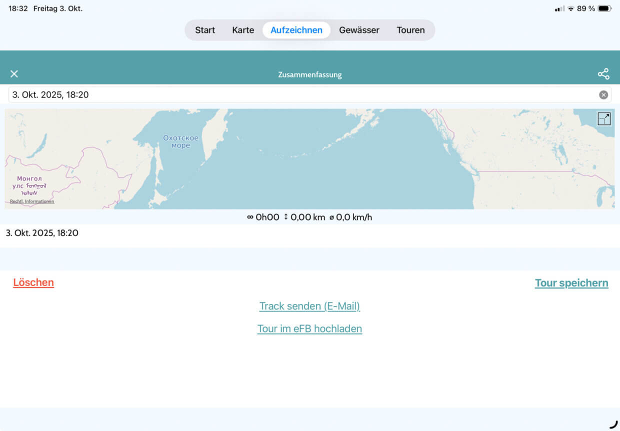 Was sehr schön ist: Man kann die aufgezeichnete Strecke an das „Elektronische Fahrtenbuch“ übermitteln. Das elektronische Fahrtenbuch EFB ist eine Webapp des Deutschen Kanuverbandes. (https://efb.kanu-efb.de) Dort kann man seine Fahrten eintragen, speichern und bewerten lassen (Ich kann das EFB gerne in einem der nächsten Newsletter genauer vorstellen). Wenn man die Canua-App entsprechend beauftragt und ihr die Freigabe gibt, füllt sie das EFB automatisch aus. Dann spart man sich das eigene handschriftliche oder sonst wie angelegte Fahrtenbuch.